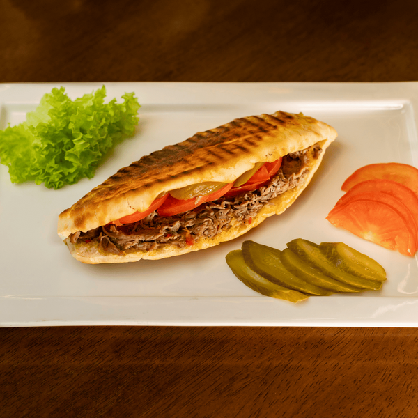 Samoon, lamb meat cooked in the oven, spices, tomato, pickles, sauce