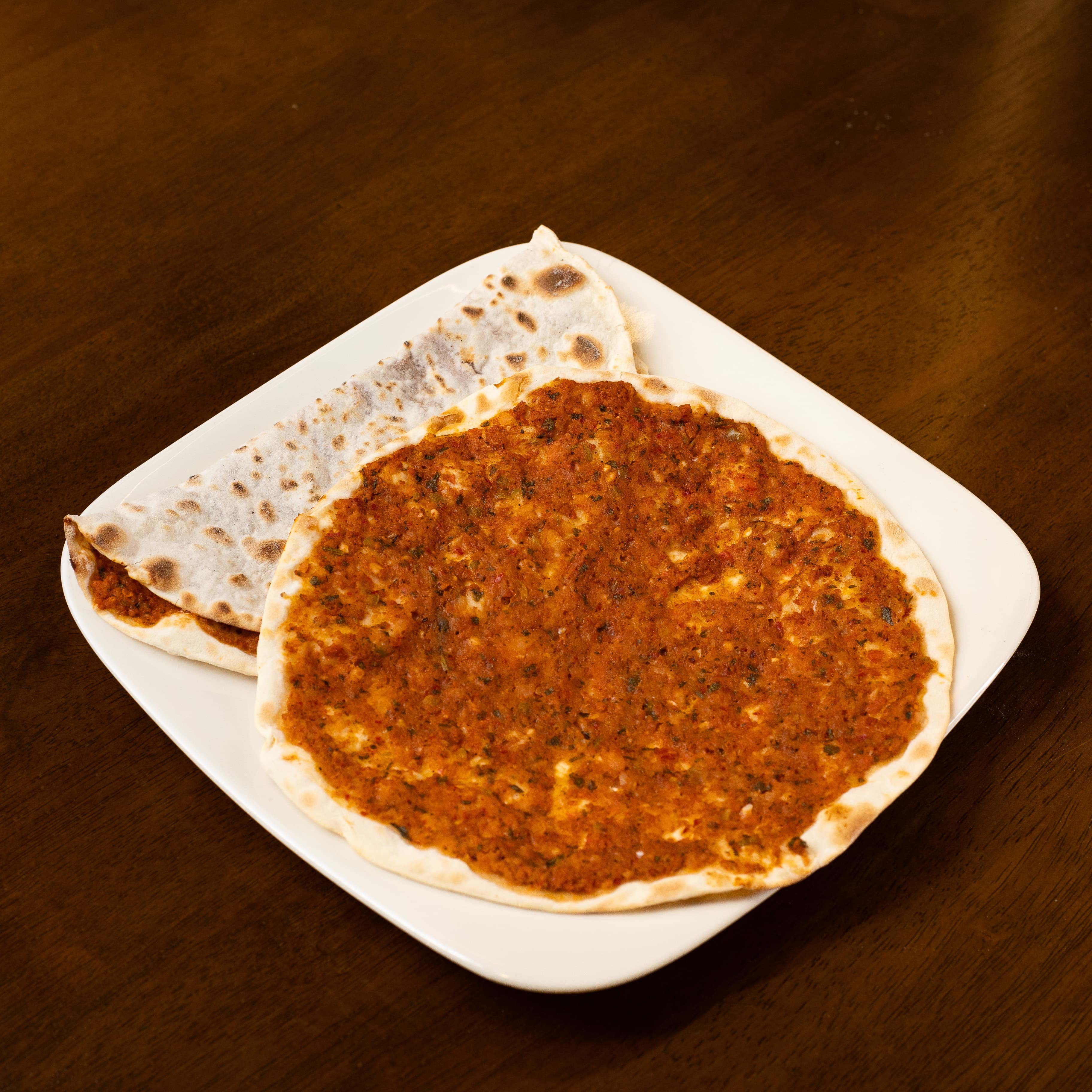 minced lamb meat with vegetables , Aleppo spices , garlic topped on thin crispy dough